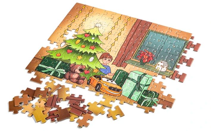 132-teiliges Puzzle in einer Aluminiumröhre mit Weihnachtsmotiv. Die Röhre kann als Geldkassette für Münzen und gefaltete Geldscheine dienen. Geeignet für Kinder ab vier Jahren.