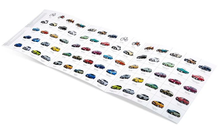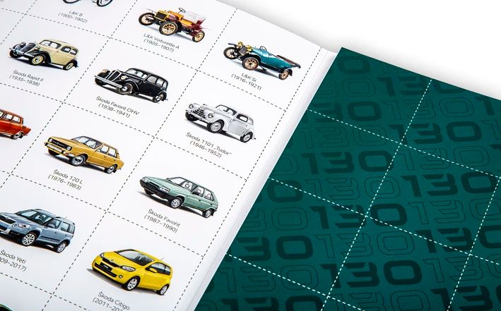 Unter den Bildern finden sich historische Meilensteine der Marke Škoda – vom Slavia-Fahrrad bis hin zu den neuesten Elektrofahrzeugen. Zusätzlich zeigt jede Karte die Produktionsjahre des jeweiligen Fahrzeugs.